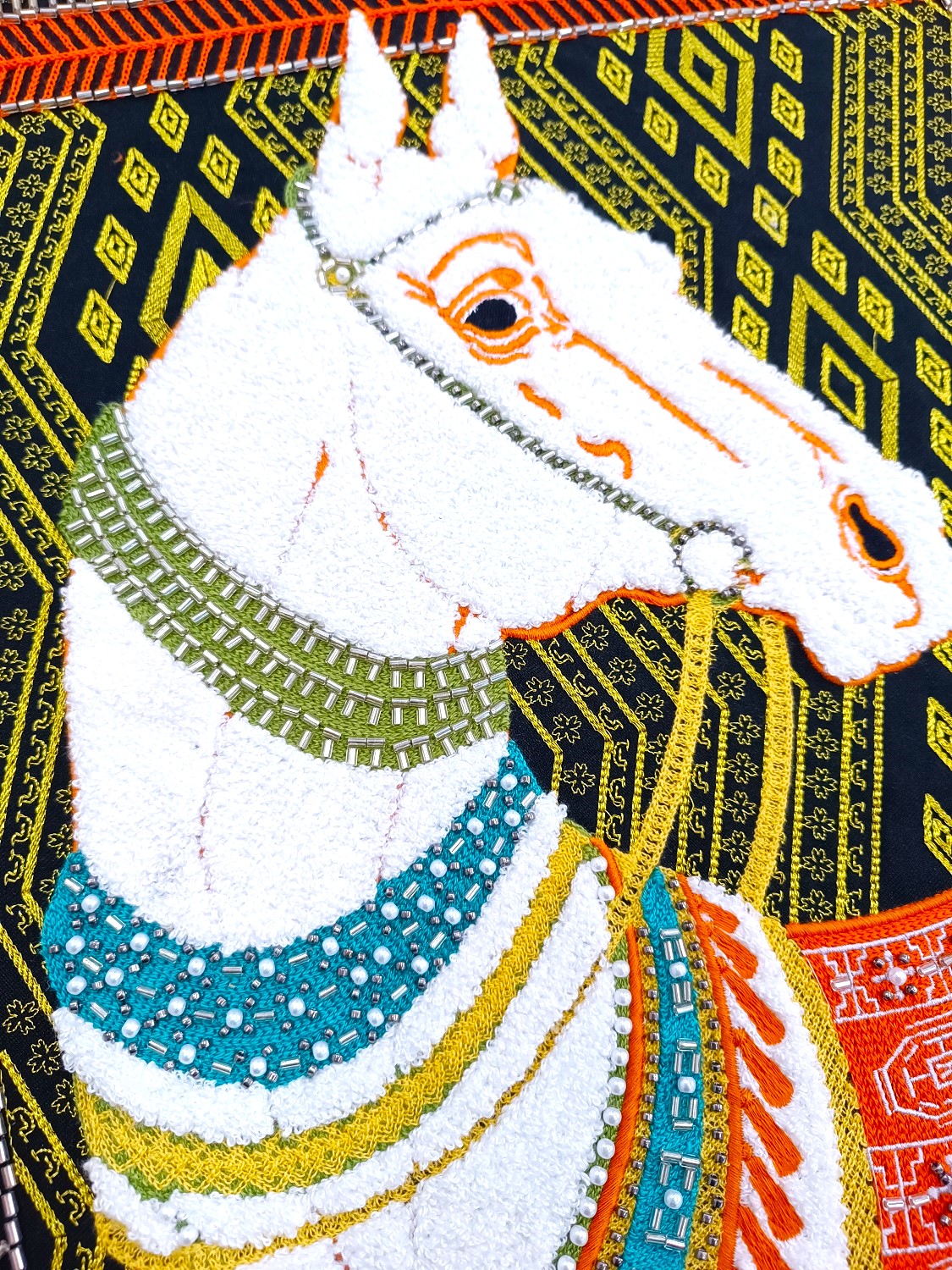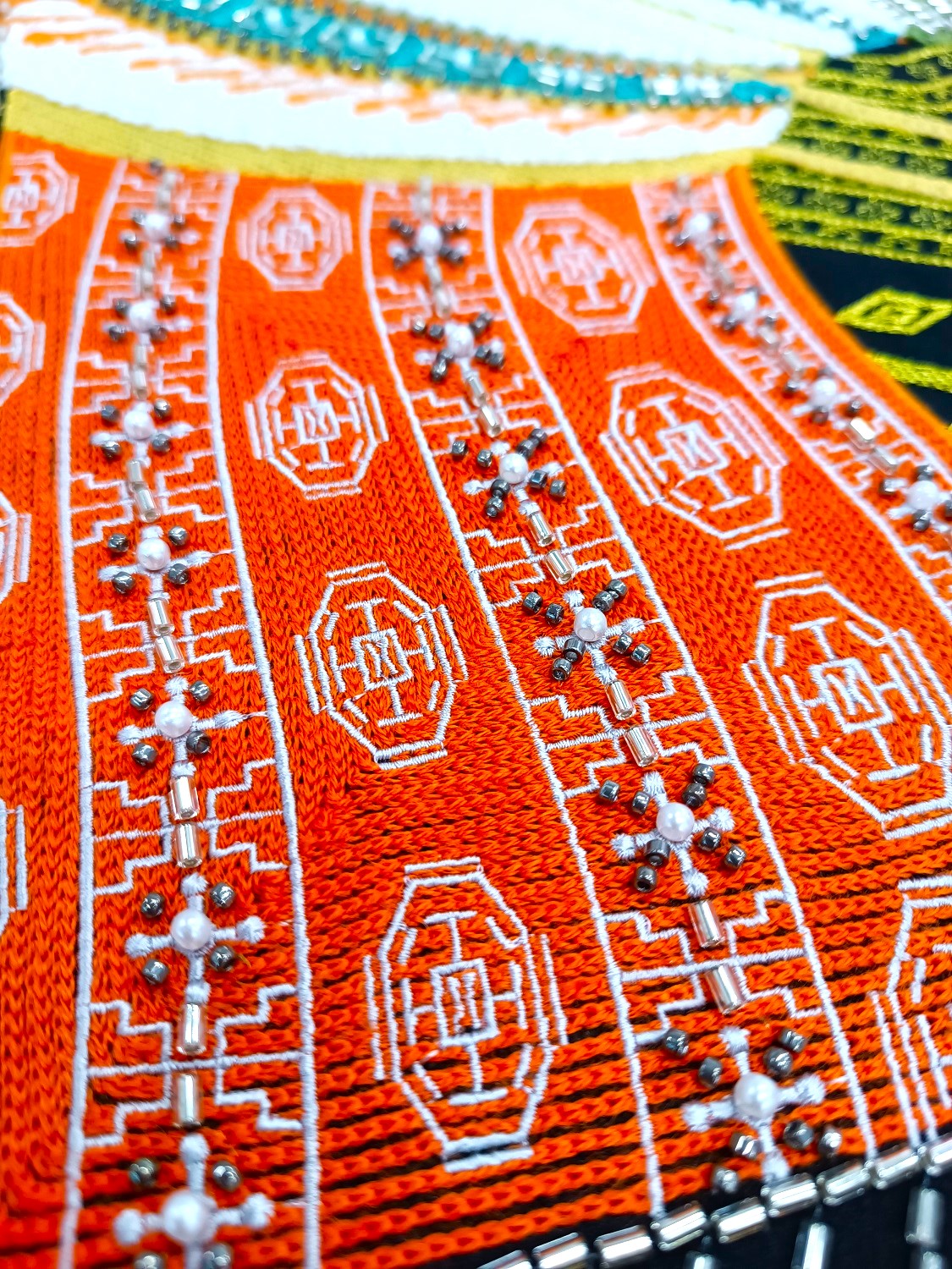 Il risultato è un capo d’abbigliamento affascinante che risplende di perline colorate che donano un effetto tridimensionale al tessuto adoperato.